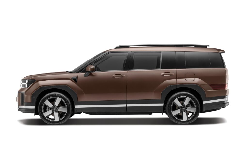 The new Santa Fe immediately stands out with Hyundai’s signature retro-futuristic design language. Its distinctive boxy aesthetic harks back to Hyundai’s of the 1980s, yet it’s seamlessly blended with modern elements. H-pattern daytime running lights connected by a light bar ensure the Santa Fe is both unique and classically appealing.